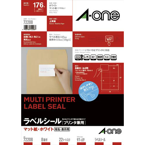 各種プリンタ兼用で印刷できる、上質紙素材のラベルシールです。「エーワン」の定番宛名、表示用ラベル。
