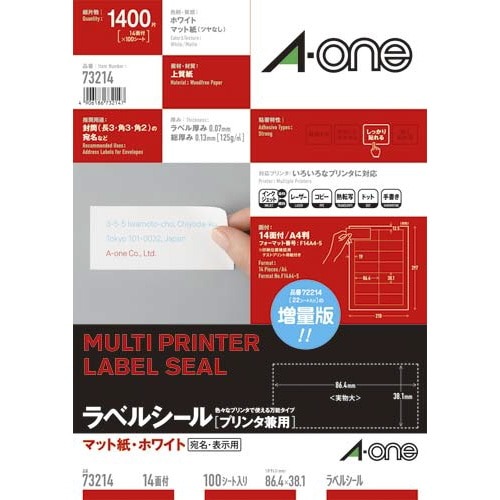 各種プリンタ兼用で印刷できる、上質紙素材のラベルシールです。「エーワン」の定番宛名、表示用ラベル。