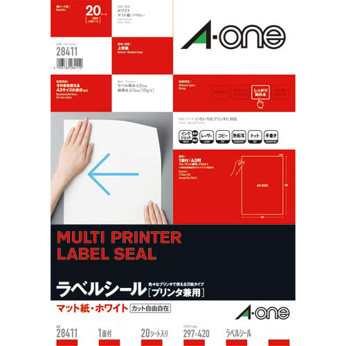 各種プリンタ兼用で印刷できる、上質紙素材のラベルシールです。ノーカットなので自由に切って使えます。A3サイズ。「エーワン」の定番紙ラベル。