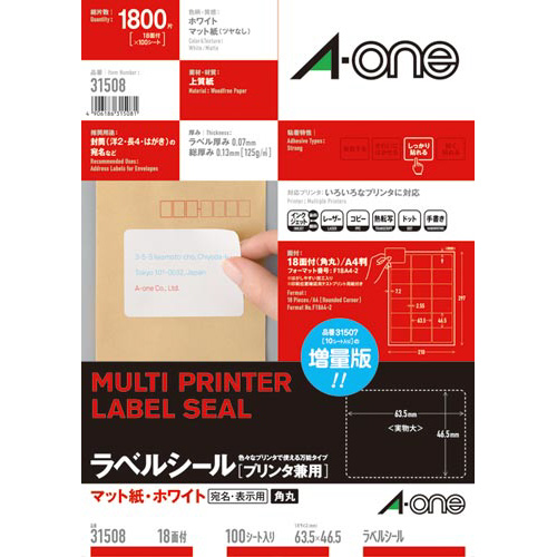 各種プリンタ兼用で印刷できる、上質紙素材のラベルシールです。「エーワン」の定番宛名、表示用ラベル。