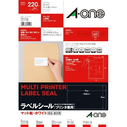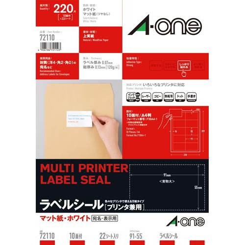各種プリンタ兼用で印刷できる、上質紙素材のラベルシールです。名刺と同じ91×55mmのラベルサイズ。「エーワン」の定番宛名、表示用ラベル。