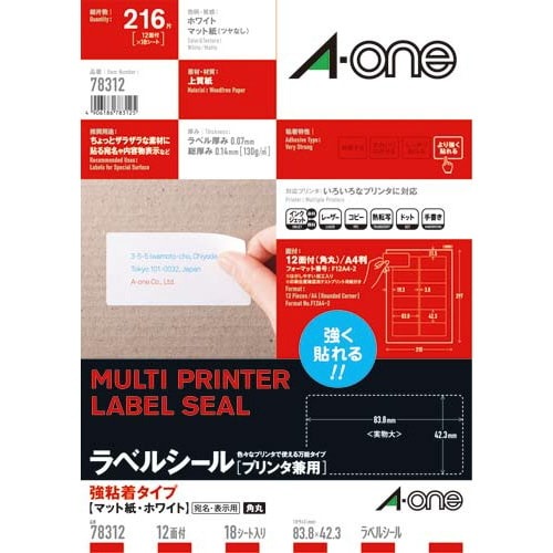 各種プリンタ兼用で印刷できる上質紙ラベルシールです。はがれやすい場所にもしっかり貼れる、強粘着タイプ。表示ラベル、宛名ラベル作成に。