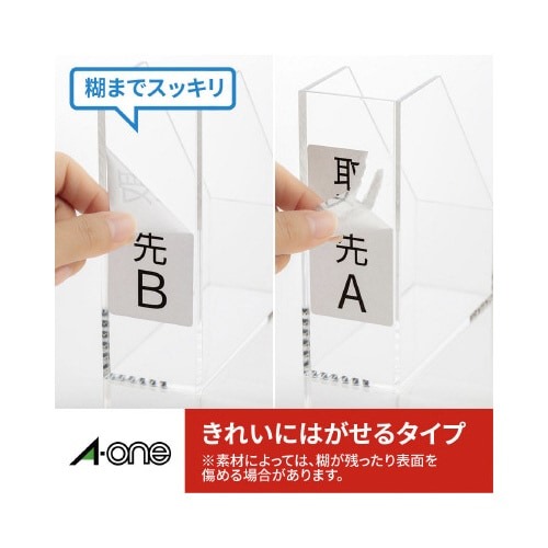 各種プリンタ兼用で印刷できる、しっかり貼れてキレイにはがせる上質紙ラベルシールです。一時的な表示や被着体を再利用したいときにおすすめです。