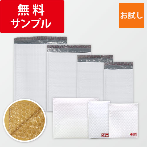 封筒の内側にエアーキャップ(気泡緩衝材)が付いた、耐水クッション封筒のサンプルセット。(7種類・各1枚)