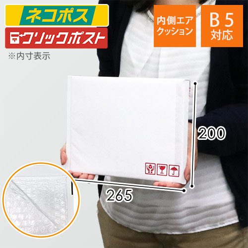 内側のエアクッションが、配送中の衝撃や多少の水濡れから商品をしっかり守ります。