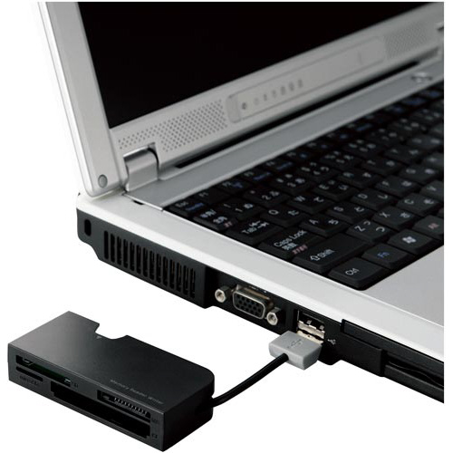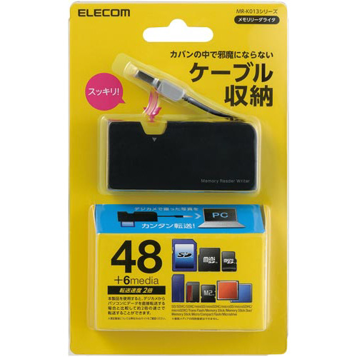 持ち運びや収納に便利なケーブル収納タイプ。コンパクトながら54種類の多彩なメディアに対応したメモリリーダライタ。