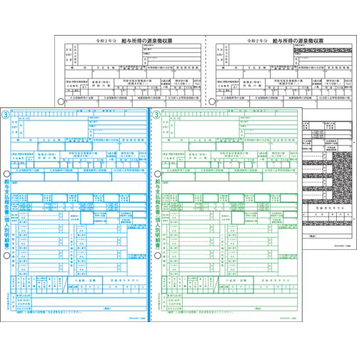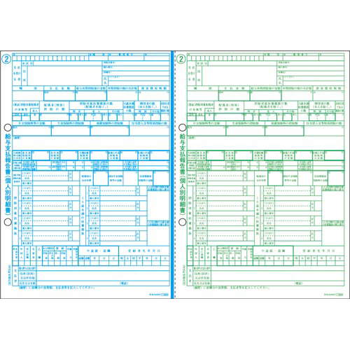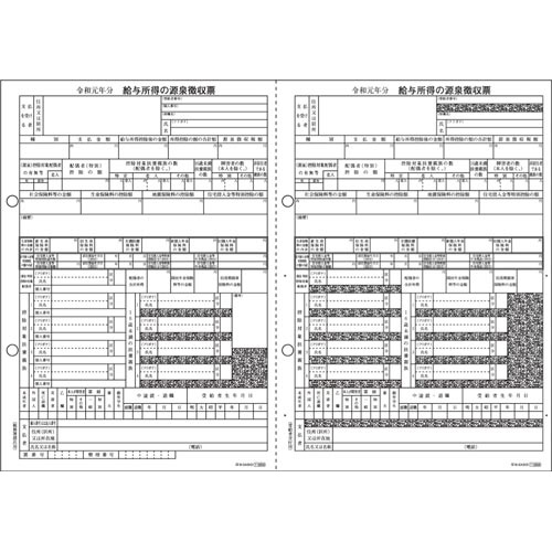 マイナンバーの記載に対応した、レーザプリンタ用の源泉徴収票です。「市区町村提出用」と「税務署提出用・受給者交付用」の2枚組です。