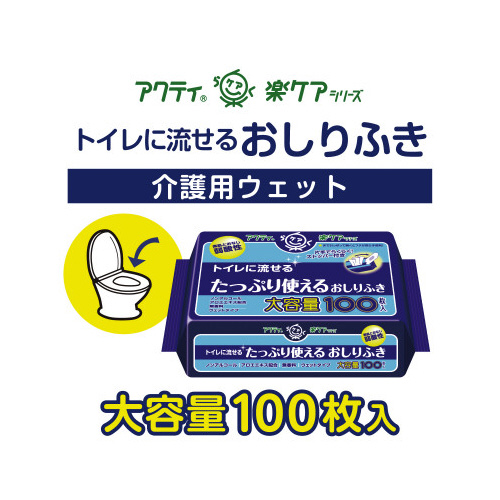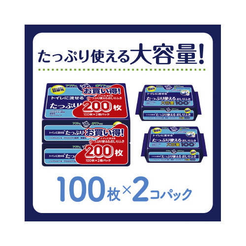トイレに流せて、経済的なたっぷり大容量タイプ。片手でらくらく取り出しストッパー機能つき。容器不要でこのまま使用でき、乾きにくいので経済的。素肌と同じ弱酸性でお肌にもやさしくかぶれにくい。