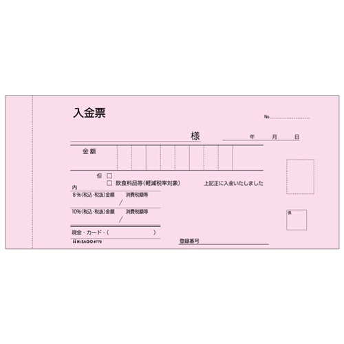 ●仕様/領収証、3枚複写(入金付)、ノーカーボン複写、小切手判、収入印紙欄あり