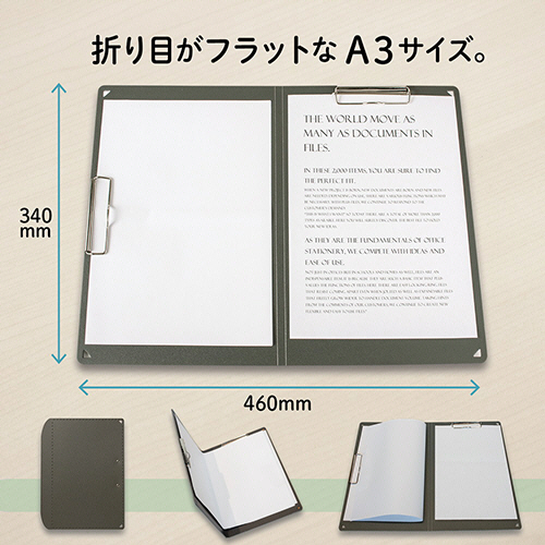 ●サイズも書き心地も秀逸。折りたためて便利なクリップボード、A3サイズで色はダークグレー。