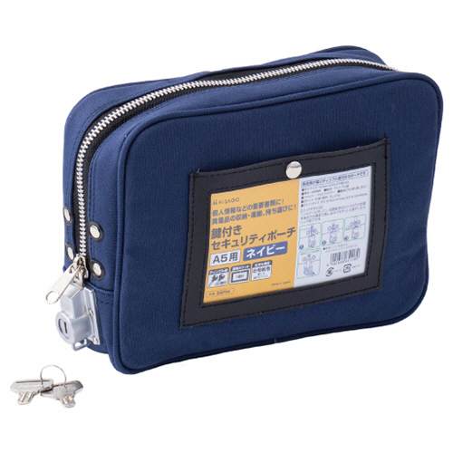 ●A5サイズ用の鍵付きセキュリティポーチ、色はネイビーです。