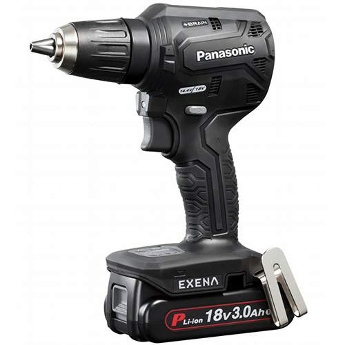 ●パワフルな連続作業を可能にするコンパクト・ドリルドライバー。18V・3.0Ah、ボディ色は黒です。電池2個付き。