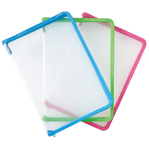 ●中身が見えて出し入れ楽々・ファスナー付きのファイルケース。色はブルー・グリーン・ピンクの96個セットです。