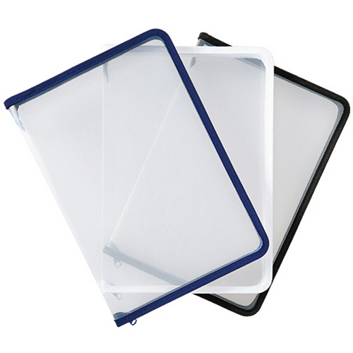 ●中身が見えて出し入れ楽々・ファスナー付きのファイルケース。色はブラック・ネイビー・ホワイトの96個セットです。