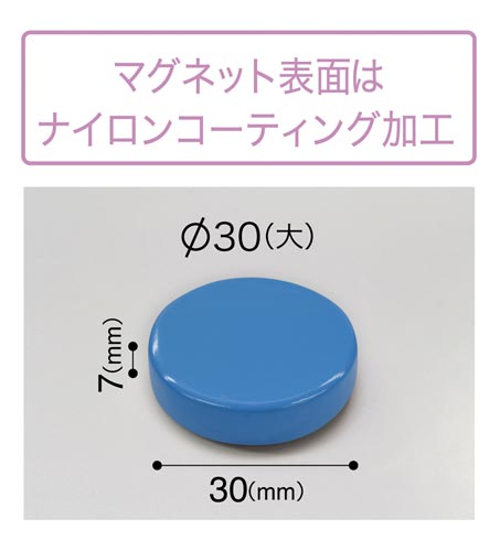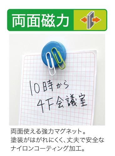 両面磁力がある強力カラーマグネットです。表面はナイロンコーティング加工なのでスチール面を傷つけません。