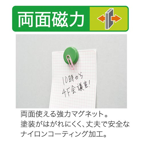両面磁力がある強力カラーマグネットです。表面はナイロンコーティング加工なのでスチール面を傷つけません。