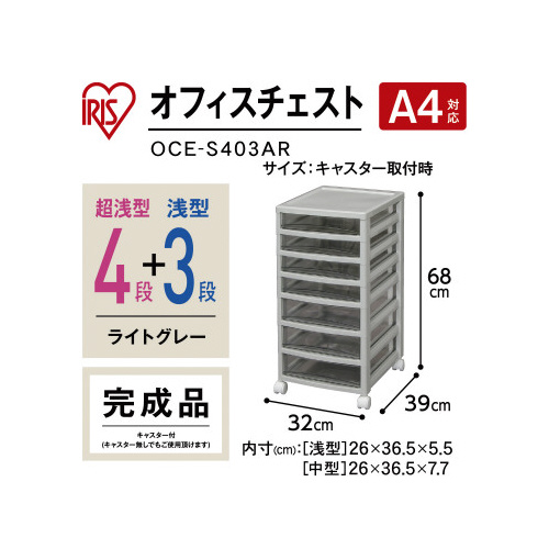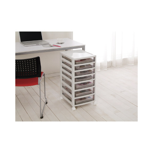 環境にやさしいリサイクル品を使用したオフィスチェストです。引き出しは中身が確認しやすいクリアタイプ。移動に便利なキャスター付き!