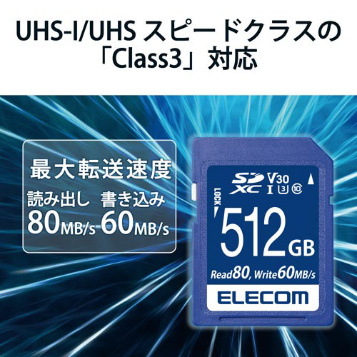 読み出し最大80MB/s、書き込み最大60MB/sの高速データ転送を実現。UHS-I,UHSスピードクラス「Class3」,ビデオスピードクラス「V30」に対応し、4K動画にも最適。