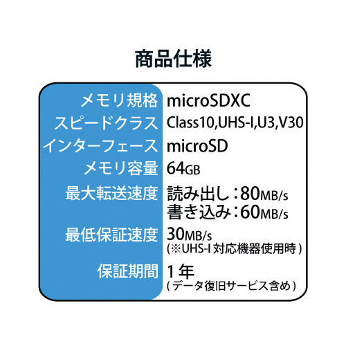 UHS-I,UHSスピードクラス「Class3」,ビデオスピードクラス「V30」に対応し、4K動画にも最適な高速タイプのmicroSDXCメモリカード。