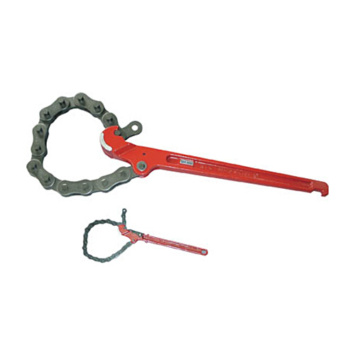 ●パイプレンチの使えない場所でもチェーンが入れば連続作業ができます。本体は特殊鋼の鍛造品で強く、歯先は高周波焼き入れを施し硬くヘタらず完全に機能を発揮します。