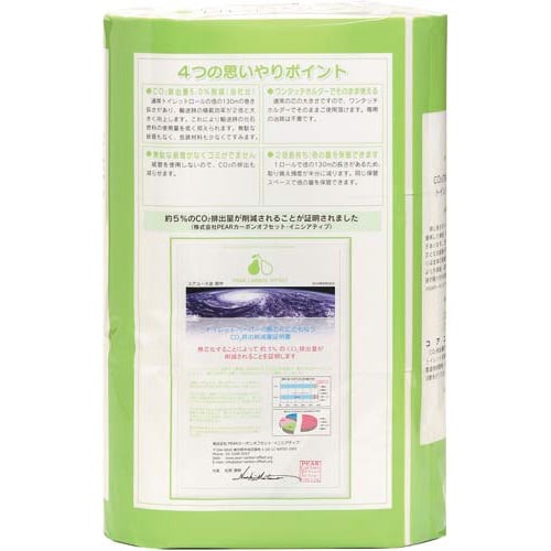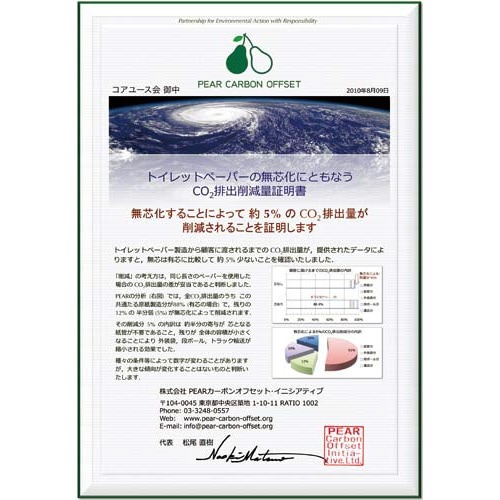 トイレットペーパーを無芯化することによって、CO2排出量が5%削減されることを証明した商品。パッケージ裏面に削減証明書を添付しています。