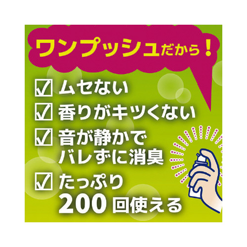 ワンプッシュするだけで、こもった臭いを瞬間消臭。壁や床からのニオイも消臭します。