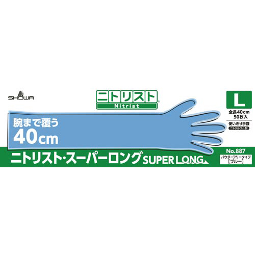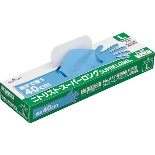 全長40cmのロングタイプで厚手のニトリルゴム使いきり手袋