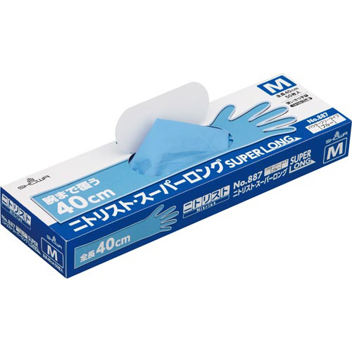 全長40cmのロングタイプで厚手のニトリルゴム使いきり手袋