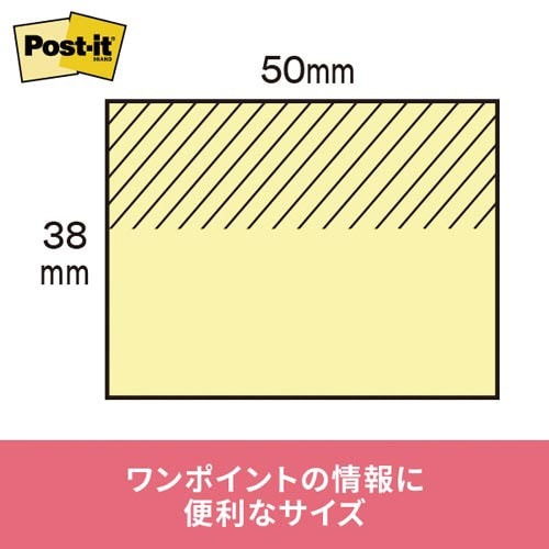 くり返し貼ったりはがしたりできるポストイット通常粘着製品です。一言メモに便利なサイズ。資源の有効利用を考え、古紙パルプ配合率100%の再生紙を使用しています。