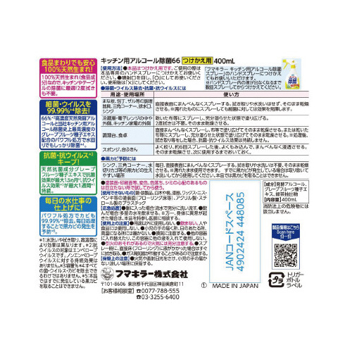 アルコール濃度66%(容量%)の除菌剤。100%天然生まれだから食品まわりでも安心!天然抗菌成分グレープフルーツ種子エキスも高濃度に配合し、濡れたシンクもしっかり除菌!毎日除菌で黒カビの発生を抑制!