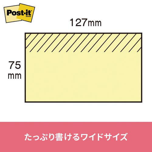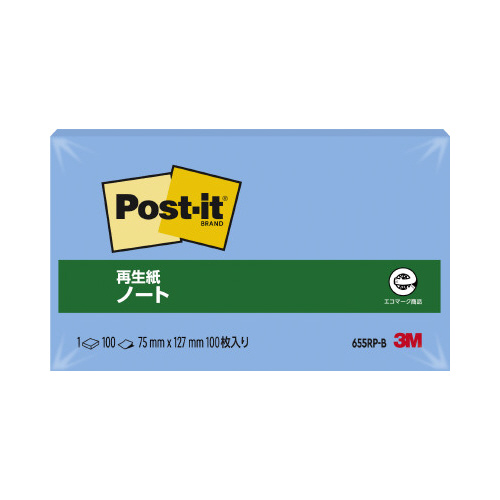 くり返し貼ったりはがしたりできるポストイット通常粘着製品です。たっぷり書き込める大判サイズ。掲示や在庫整理に。資源の有効利用を考え、古紙パルプ配合率100%の再生紙を使用しています。