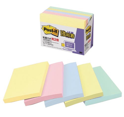 つきにくかった樹脂面にもしっかり貼れて、きれいにはがせる強粘着タイプのポストイット。たっぷり書き込める大判サイズ。文字が見やすいパステルカラー。お得な混色5冊パックの5個セット。