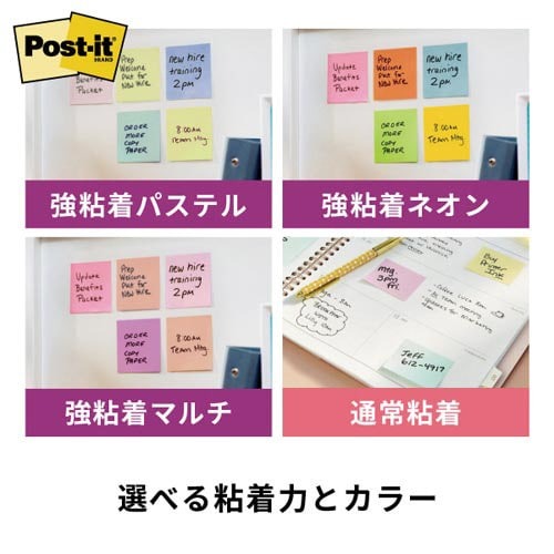 つきにくかった樹脂面にもしっかり貼れて、きれいにはがせる強粘着タイプのポストイット。ちょっと詳しい伝言、情報整理などに便利な、定番の正方形サイズ。見落とし防止に役立つネオンカラー。