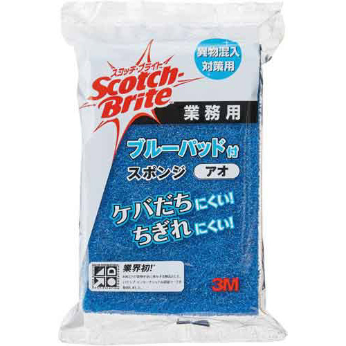 異物混入対策用スポンジです。高耐久の不織布パッドだからちぎれにくく、仮にちぎれても、食品に少ない青色なので破片を見つけやすい。樹脂製の研磨粒子がしっかりと固着しているのでクリーニング力を長く維持。