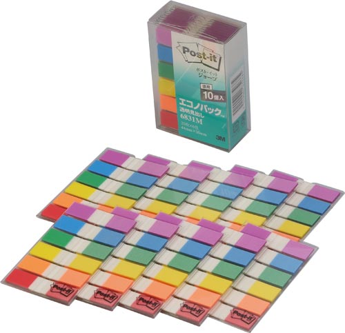 じょうぶで破れにくい、フィルム素材のポストイットです。貼ると透明になり下の文字や絵を隠しません。上から文字も書き込めます。本や書類の分類や見出しに。6色セットで、色分けにも便利。お得な10個セット。