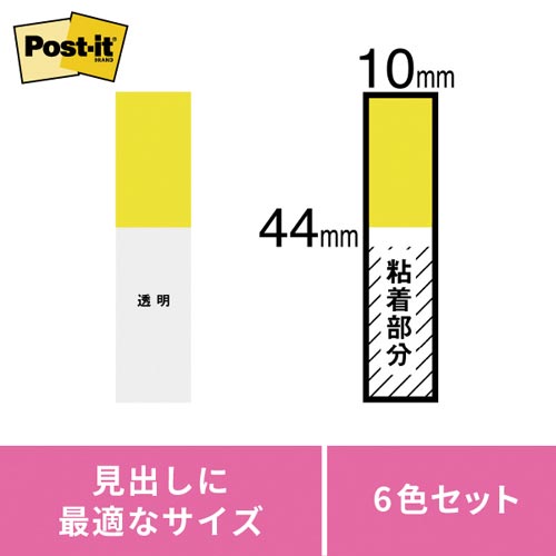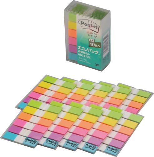 じょうぶで破れにくい、フィルム素材のポストイットです。貼ると透明になり下の文字や絵を隠しません。上から文字も書き込めます。本や書類の分類や見出しに。6色セットで、色分けにも便利。お得な10個セット。