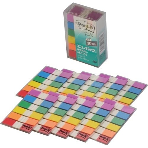 じょうぶで破れにくい、フィルム素材のポストイットです。貼ると透明になり下の文字や絵を隠しません。上から文字も書き込めます。本や書類の分類や見出しに。6色セットで、色分けにも便利。お得な10個セット。