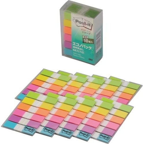 じょうぶで破れにくい、フィルム素材のポストイットです。貼ると透明になり下の文字や絵を隠しません。上から文字も書き込めます。本や書類の分類や見出しに。6色セットで、色分けにも便利。お得な10個セット。