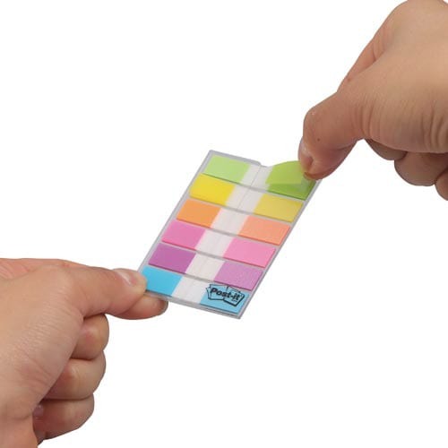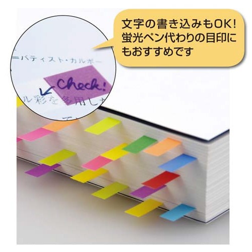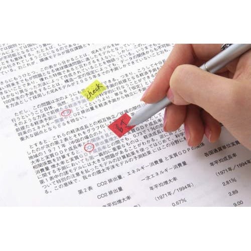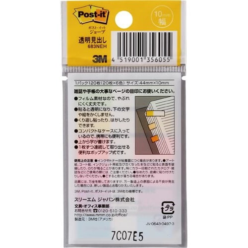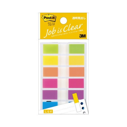 じょうぶで破れにくい、フィルム素材のポストイットです。貼ると透明になり下の文字や絵を隠しません。文字を書き込むことも出来ます。本や書類の分類や見出しに。6色セットで、色分けにも便利な付箋。