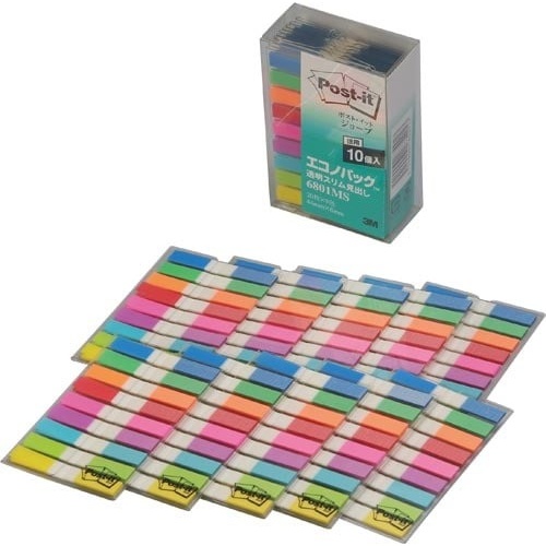 6mm幅のスリムサイズのフィルムふせん。貼っても下の文字などが透けて見え、また貼った上から字を書くこともできる、つや消し加工フィルムの見出しです。色数が多く、色分けにも便利です。お得な10個セット。