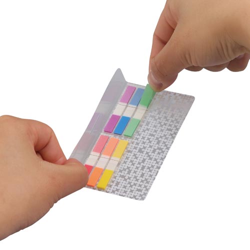 6mm幅のスリムサイズのフィルムふせん。ペンケースにも収納しやすい細長いケース入。貼っても下の文字などが透けて見え、貼った上から字を書くこともできる、つや消し加工フィルムの見出しです。色分けにも便利。