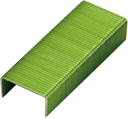 失敗とじが少ない、マックス針の「先端技術」。針の素材を生かしたメタリックな仕上がりです。針の色で書類を分類できます。
