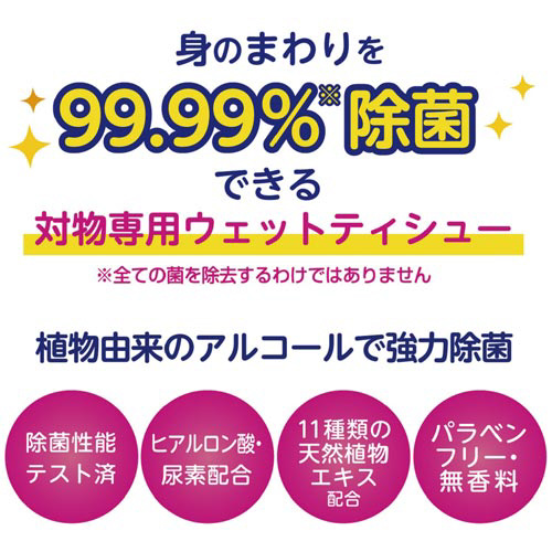 身のまわりの除菌に。植物由来のアルコール配合で強力除菌。ヒアルロン酸・尿素・11種の天然植物エキス入り。ふんわり厚手やわらかシート。パラベンフリー。