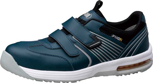 【超耐滑・静電仕様の高機能な先芯入スニーカー】つま先をしっかり守るワイド樹脂先芯入り。耐圧迫荷重は約1トン。靴底が滑りにくい特殊仕様のため、転倒防止に役立ち、安全に仕事ができます。静電気も逃がし、かかとにエアーを搭載し、衝撃を吸収をするハイスペックシューズ。夜間に安全な光に反射するリフレクターライン付。脱ぎ履きしやすいファスナーテープ式。作業服に合わせやすいシックなネイビー色。
