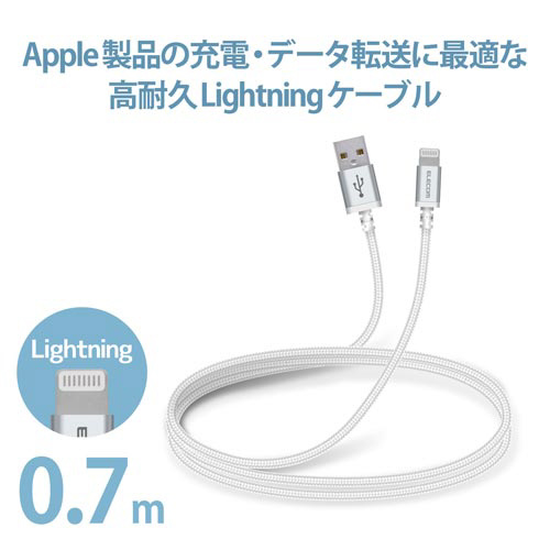 耐久力約10倍で断線に強い。(※メーカー比)iPhone・iPod・iPadなどのLightningコネクタ搭載機器の充電・データ転送が可能な高耐久Lightningケーブル。