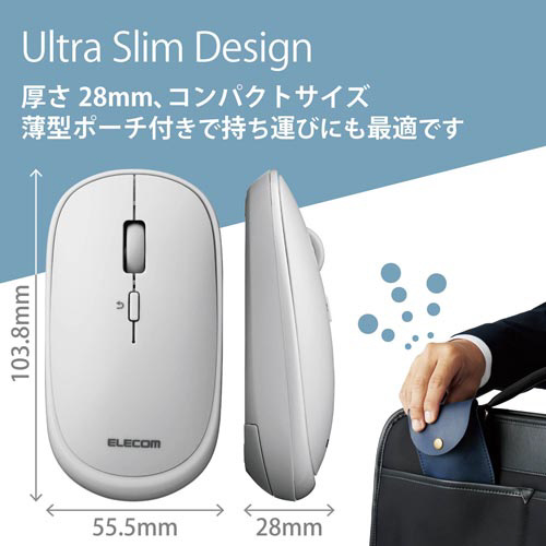 厚さ28mmの薄型設計でカバンに入れて持ち運びしやすい!ソフトレザー製収納ポーチが付属したBluetooth(R)モバイルマウス“Slint(スリント)”。