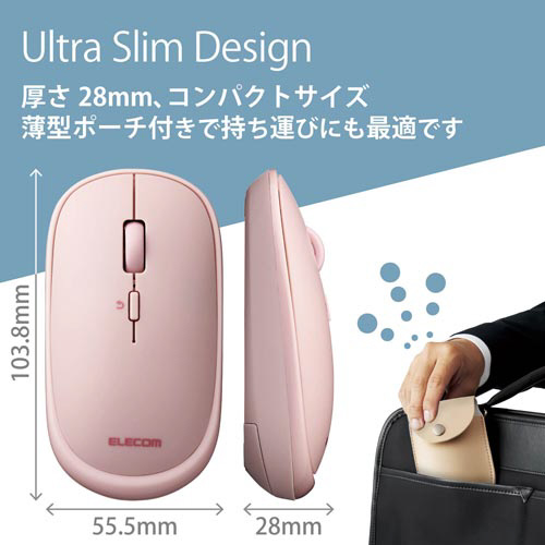 厚さ28mmの薄型設計でカバンに入れて持ち運びしやすい!ソフトレザー製収納ポーチが付属したBluetooth(R)モバイルマウス“Slint(スリント)”。
