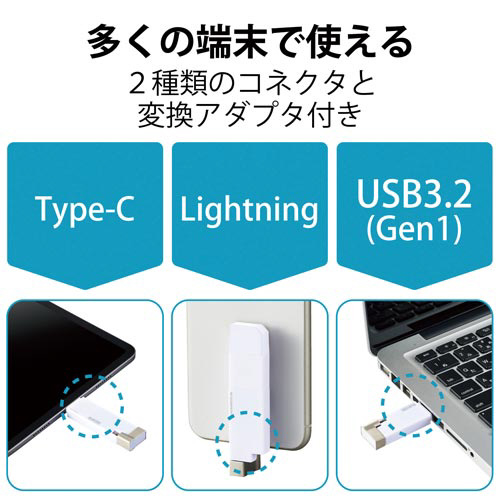 USB-AコネクタとLightningコネクタに加え、USBType-C(TM)変換アダプタも付属したマルチに使えるUSB3.2(Gen1)メモリ。