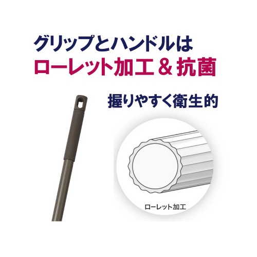 業務用ワイドサイズのフロアワイパー。ローレット加工で凹凸のあるパイプとグリップで握りやすく使いやすい。抗菌仕様で衛生的。ワニ口クリップにシートを差し込むだけで簡単フロア清掃ができる。