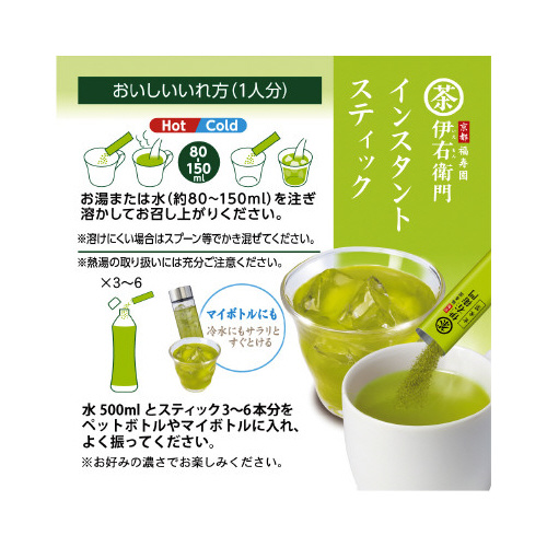 簡単手軽な、伊右衛門インスタント緑茶スティックシリーズ。飲みたい分だけ、開封してすぐに利用可能。お湯でも水でもお飲みいただけます。